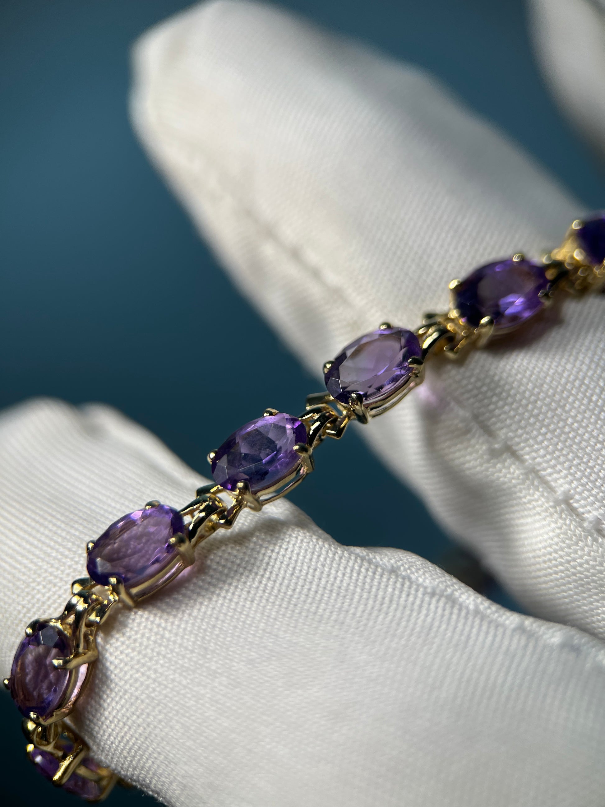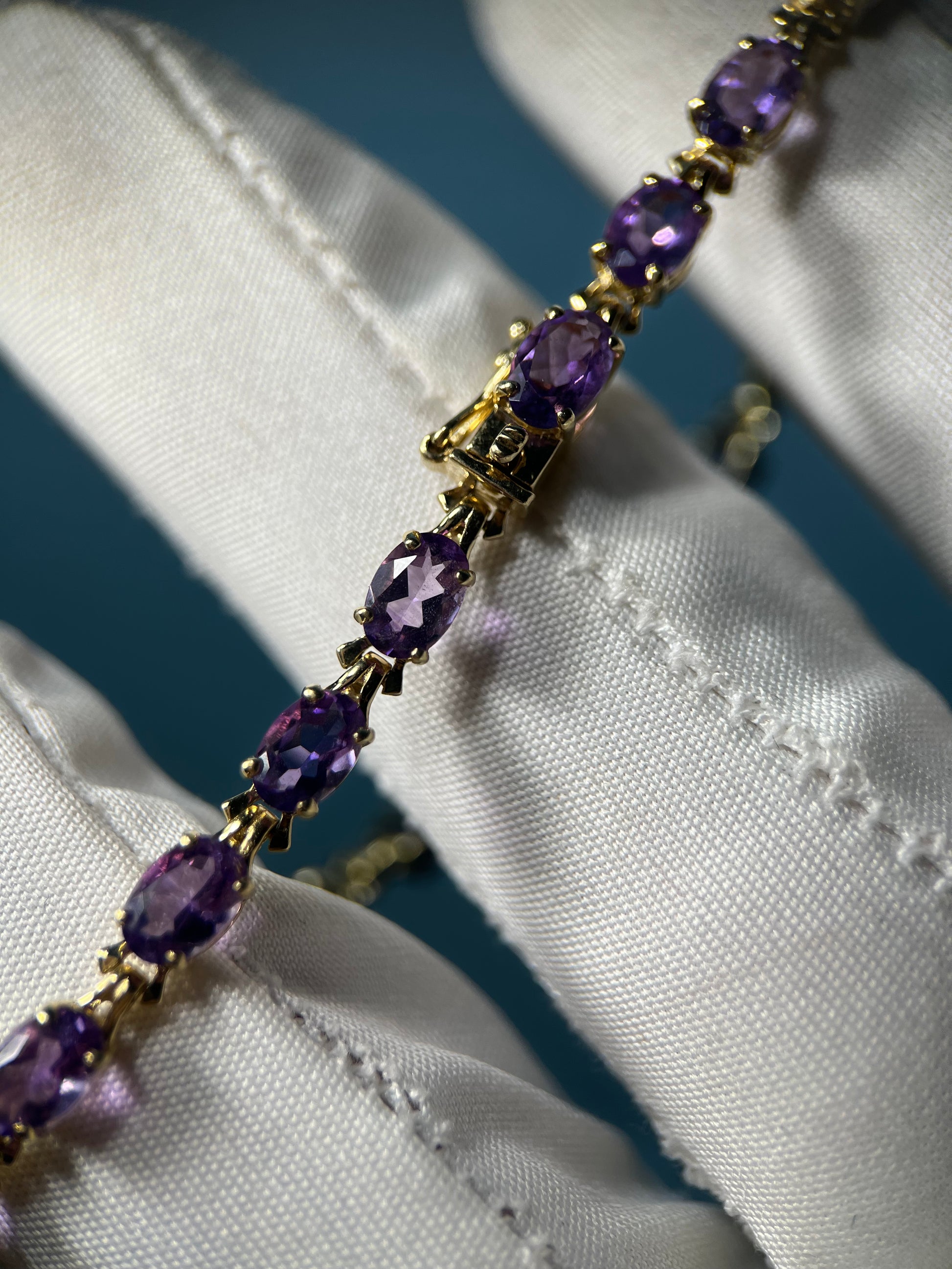 Now available this beautifully vibrant solid 14k amethyst tennis bracelet. Each amethyst is prong set in double gallery settings, the whole bracelet has between 9.5 carats (Approx.) of high clarity hand selected natural amethysts. Each roughly .7 carat in size (jewelers estimation). 7 inches long.